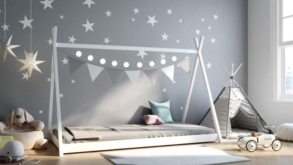 Si vous n’êtes pas à l’aise avec un simple matelas en guise de lit pour votre bébé et que vous craigniez qu’il tombe la nuit, vous pouvez l’entourer de petites barrières pour vous rassurer. Si au contraire vous appréciez le principe du lit très épuré, vous être libre d’opter pour un matelas au sol ou pour un lit cabane ou tipi.